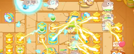 4、继续在右侧补充并升级正极电池,集中火力清理上方的道具。