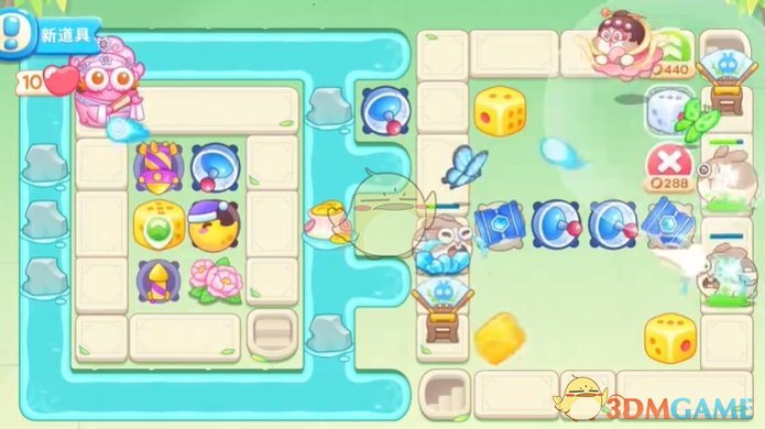 3、将右侧的道具清理差不多后,在角落放置2个骰子并升级;