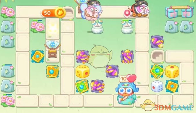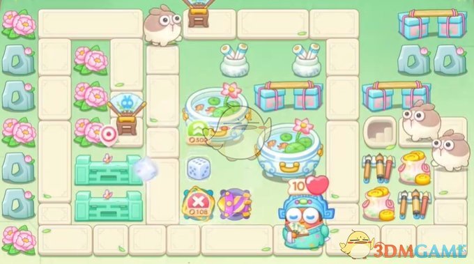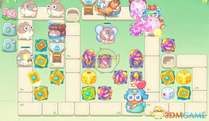 1、首先在萝卜附近放置卡牌、骰子和火箭,清理左侧道具;