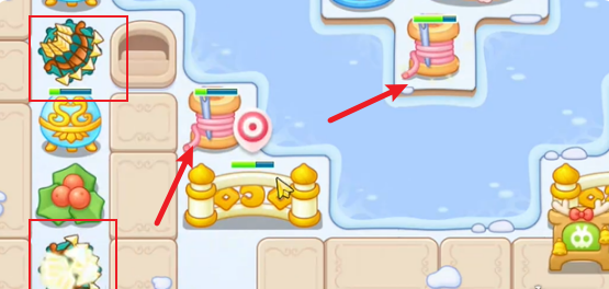 1、胡桃夹子第19关首先在左侧摆两个弓箭炮塔,优先攻击敌人,其次是毛线障碍物。