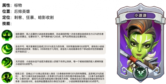 左右开弓:每次普通攻击造成2次55%攻击力的伤害,同时恢复自身100点怒气,进场后小迦迦会释放被动效果:悄摸儿(布阵时处于几号位,就会在入场后隐身状态下移动到对位的英雄身前开始攻击)。