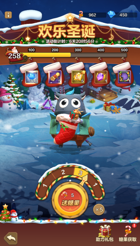 点击圣诞活动图标进入活动界面后,点击“送糖果”按钮,消耗糖果即可启动光标指针转动,再次按下按钮即可获得积分。
