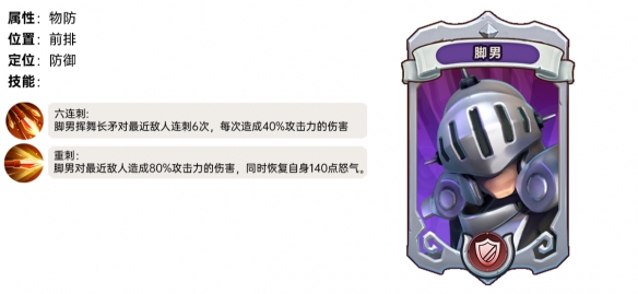 脚男挥舞长矛对最近敌人连刺6次,每次造成40%攻击力的伤害