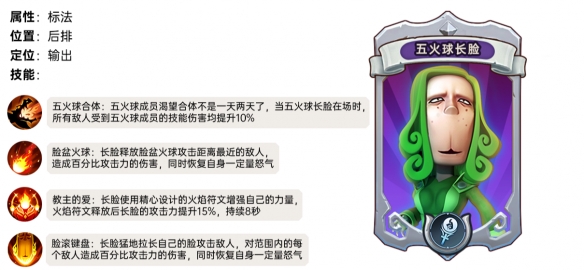 五火球成员渴望合体不是一天两天了,当五火球长脸在场时,所有敌人受到五火球成员的技能伤害均提升10%