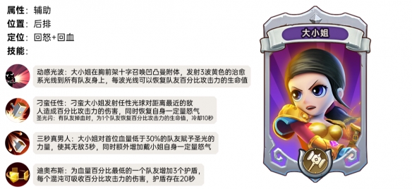 技能效果:大小姐为第一个血量低于30%的队友提供圣光buff加成,让他获得3秒无敌效果,然后回复一定的怒气。