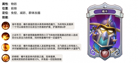 猛牛落泪:桶牛委屈的泪水具有神奇的魔力,为所有队友提供一个可以吸收百分比攻击力伤害的护盾,护盾持续6秒;