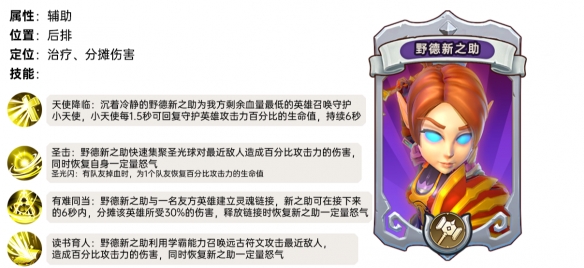 天使降临:沉着冷静的野德新之助为我方剩余血量最低的英雄召唤守护小天使,小天使每1.5秒可回复守护英雄攻击力百分比的生命值,持续6秒