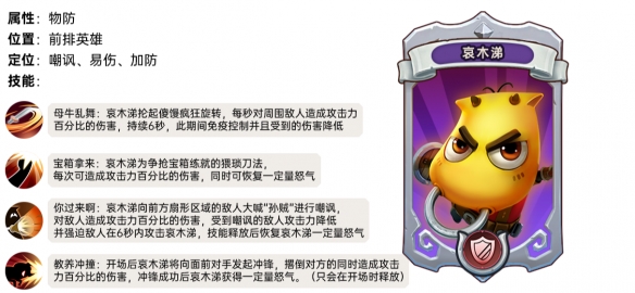 母牛乱舞:哀木涕抡起傻馒疯狂旋转,每秒对周围敌人造成攻击力百分比的伤害,持续6秒,此期间免疫控制并且受到的伤害降低;