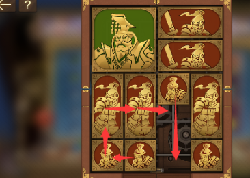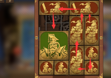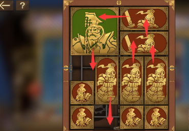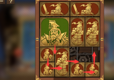 5、之后将中间的长方形向右移动,将军也向右移动,所有下面的正方形除了右下角的那个全部向左并向上排列。
