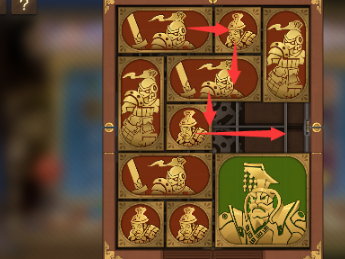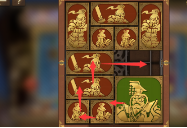 1、先将右侧的正方形向上移动,再将其左边的正方形向右移动,然后让将军向下一格。