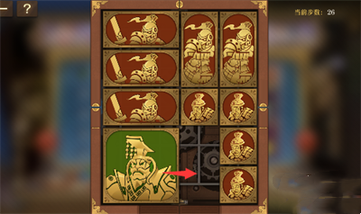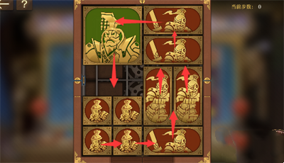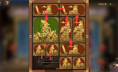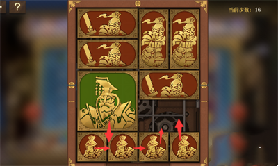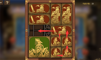 1、将军向下移动,右上侧长方形向左侧移动,右侧其它方块都向上移动一格,左下的两个正方形移动到右边;