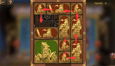 4、左上的小正方形移动到中间上方的格内,左上角的长方形下移,中间最上侧的小正方形往左移动;