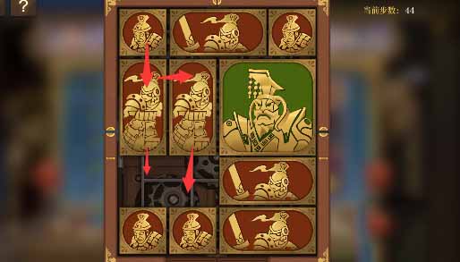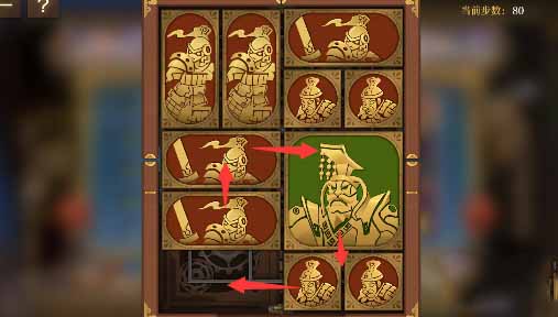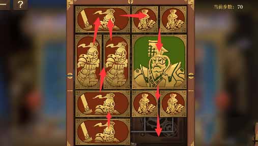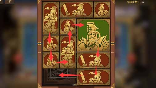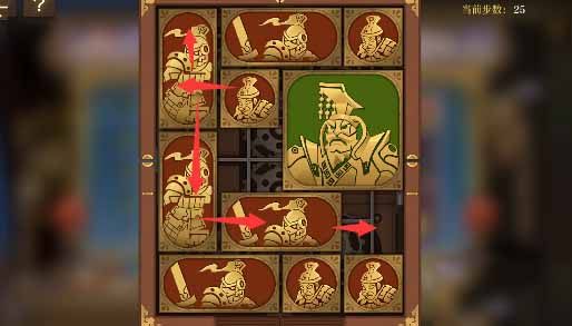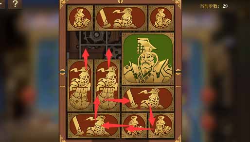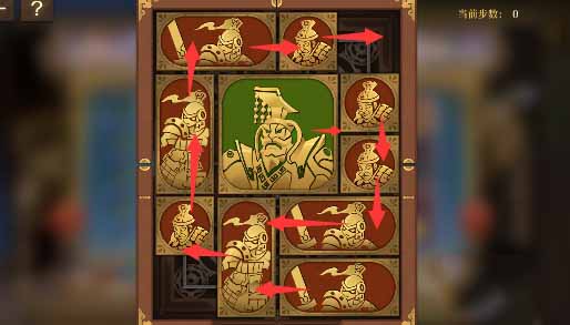 1、右上角的小方块开始向右移动,然后外圈全部跟一格,右下两个水平方块向左移一格,其上方的小方块向下移动,然后让将军向右移动一格。