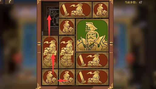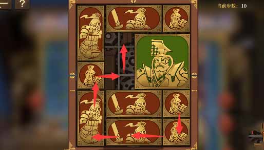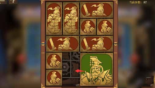 10、下半部分的方块继续顺时针旋转,最后让左下角的小方块全部贴边让将军向左移动一格即可完成本关。