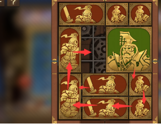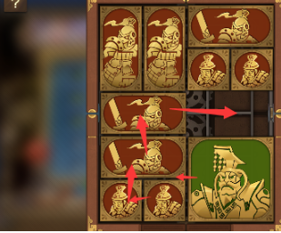 1、先将下方倒数第二排横着的长方形想走移动,然后右侧除了右上角的正方形全部向下一格,将军向右一格。
