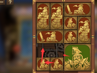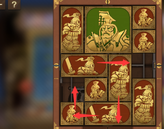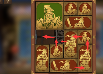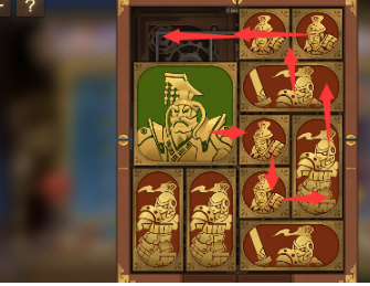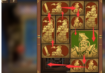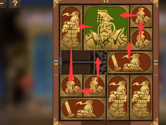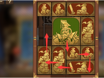 6、右上角的两个正方形向左移动,正方形下方的长方形向上移动,竖直长方形也向上移动,中间的两个正方形横过来摆,将军向右移动。