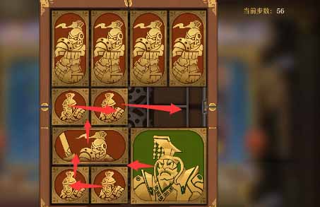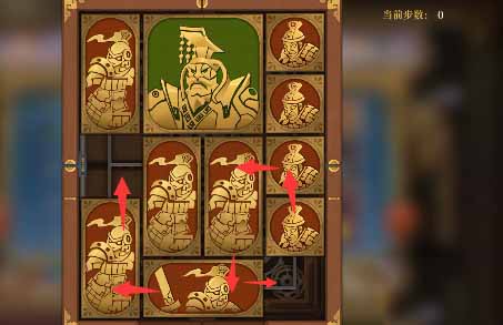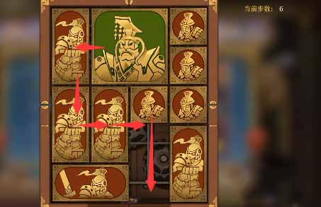 5、将军下移,右上小方块左移,右侧全部上移,下方竖直方块右移一格,其左侧的小方块移动到最下方一排的空格处,将军可以再下移一格。