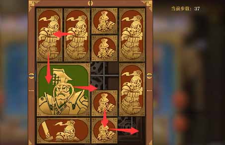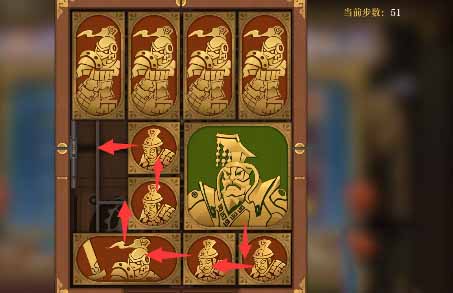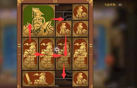 6、将军下移之后上方小方块竖直向右摆放,左上角竖直方块右移,左下的竖直方块上移,将军左移一格,右侧中间小方块左移一格,右下角竖直方块上移一格。