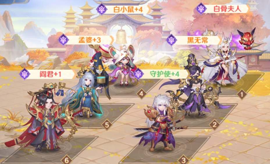 白骨夫人是群体攻击,黑无常输出+减怒,小白鼠治疗回血,孟婆可以快速回复怒气并且为接下来出手的友方提供伤害加成。阎君与孟婆配合有概率触发中毒效果持续消耗敌人血量。
