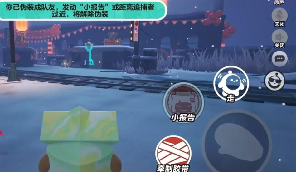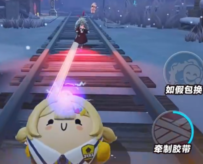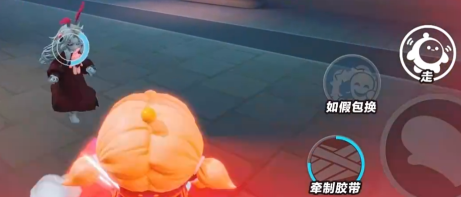 还有一个技能是牵制胶带,可以丢出胶带卷去粘住追捕者。这个技能用起来有点技巧,需要围着追捕者逆时针绕圈,来增加缠绕进度。缠绕成功后,可以让追捕者减速,而且减速效果会越来越强。实战中配合队友使用效果会更好