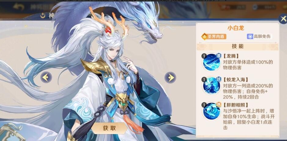 帅小伙挺记仇的,突破+15时能立刻释放一次不耗怒气的技能,打你了,他怒气也没消,下回见到还揍你。小白龙除了还手快,还很讲“义气”,突破+11时能代替队友成为攻击目标,吸引火力替队友抗伤害,不愧是一名合格的圣界肉盾,非常克制切后排的阵容。