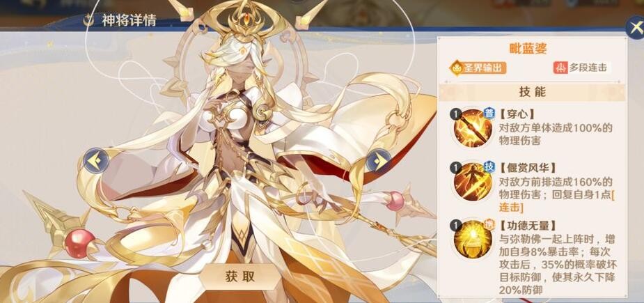 打人要打残,和弥勒佛一起上阵时,毗蓝婆的攻击有概率使攻击目标永久下降20%防御。释放技能可以回复【连击】点,这姐们不是一般的能生气,前期最高能储存5连击点,后期能到8点!就问谁能遭得住,站着挨她揍8下,还不算她先放了一个技能,就问这8下,谁能遭得住!