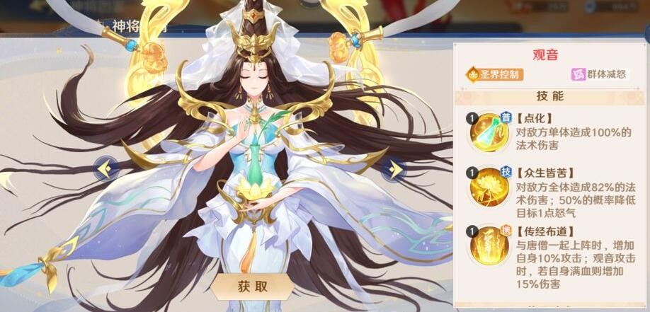 技能全体回血,和观音一起上场时可以为己方全体附加【清心I】(攻击女性目标时增加8%伤害)。队友连击点越多,治疗效果越好,师父不近女色,被女将攻击,会增加自身40%免伤。