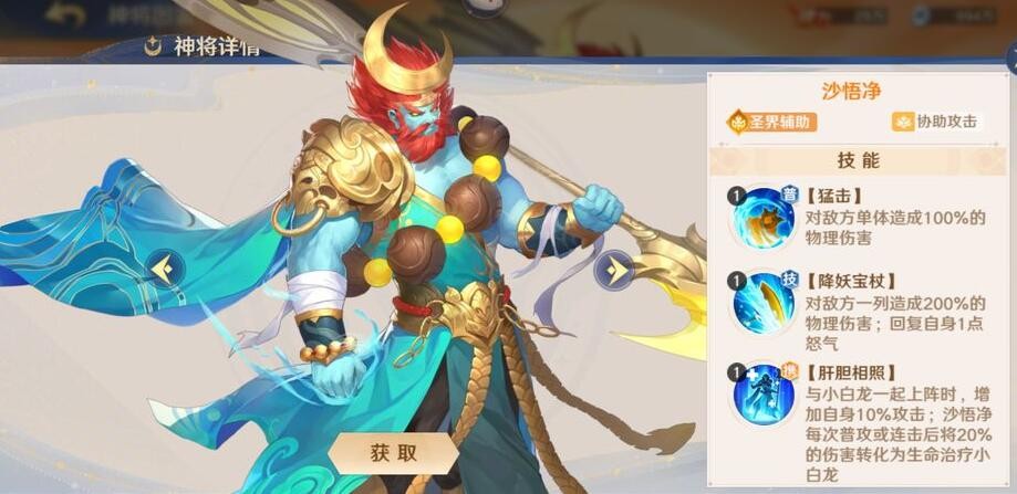 我第一次注意到他,还是站他对面挨打的时候,别人打我一下,他跟着揍我一下,谁揍我,他都跟,每次都有他。突破+5的沙师弟100%协助己方神将的连击,而且与小白龙还有连携关系。沙悟净和小白龙一起上场时,普攻或连击后有概率治疗小白龙,一个补伤害的辅助还干起了奶妈的活儿。