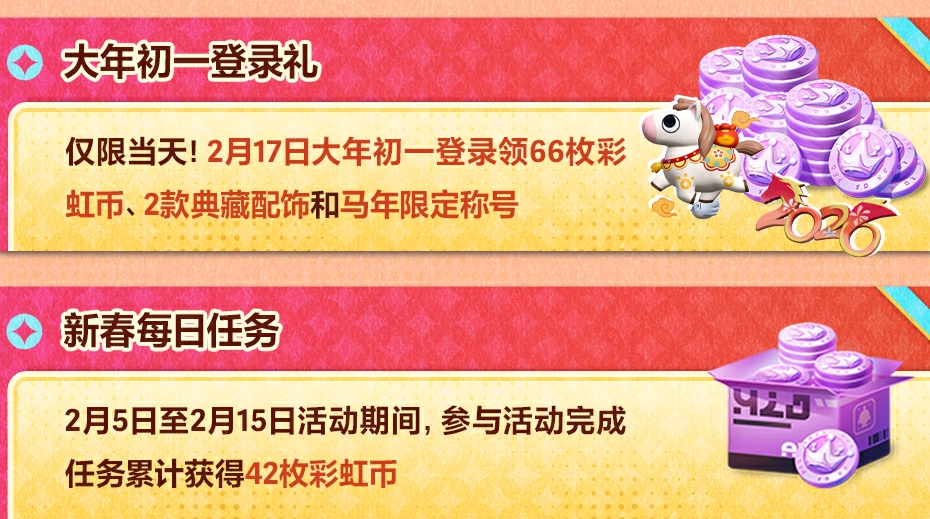 活动期间,主界面将新增新春活动视频入口,观看完整视频即可领取40枚限时蛋币。另一重点福利为新年登录礼:2月17日(农历大年初一)当日登录,即可领取66枚彩虹币、2款典藏配饰及马年限定称号。同期开放的新春特殊每日任务,完成全部阶段后总计可获42枚彩虹币。
