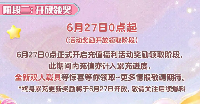 首先要提到的,当然是这次周年庆活动中最具吸引力的福利环节——充值返利。活动分为两大阶段,不仅让玩家在短期内体验到了丰厚的奖励,也巧妙地借助了“延迟满足”的心理,激发了玩家的参与热情。第一个阶段是预充值期(6月6日-6月26日),只要你在这个时间段充值,就能得到100%的充值返利,并且额外获得一个限定表情《惊喜礼物》。虽然这款表情并不会提升你的角色属性,但借着动态特效,它一定能成为你在社交平台上的亮眼话题。而等到第二阶段,大家可以在6月27日到7月10日期间领取奖励,累计充值30元就能解锁一款限定的双人载具“糖果热气球”。这辆载具不仅有着甜蜜的糖果特效,还需要两个人协作才能控制它,完全符合情侣或朋友间的互动需求。