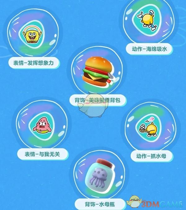 3、活动奖励包含:背饰-美味蟹堡背包、背饰-水母瓶、表情-发挥想象力、表情-与我无关、动作-海绵吸水、动作-抓水母