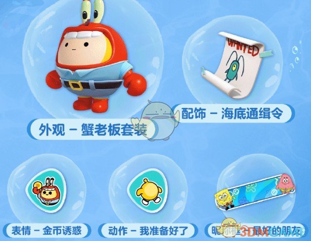 配饰一海底通缉令、外观一蟹老板套装、表情-金币诱惑、动作一我准备好了、昵称框一最好的朋友