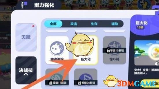 完成装配后,退出到游戏大厅。在技能列表中点击【巨大化】技能图标,即可使用该技能,使蛋仔变大。