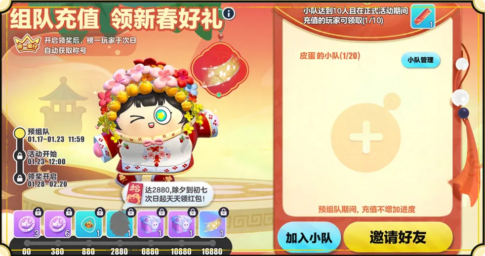 以上就是小编整理带来的《蛋仔派对》新春充值福利:组队好礼活动内容一览,更多相关游戏攻略,请关注手游网!