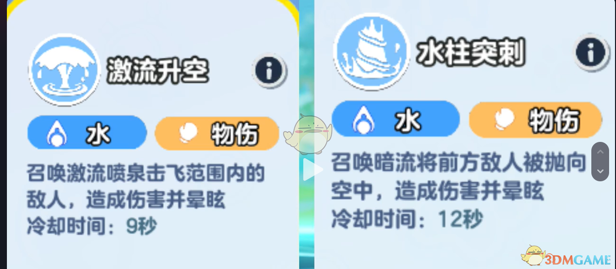 4、还有两个控制技能,激流生空和水珠突刺,都能给敌人造成眩晕效果,但是它也同样会误伤范围内的友军,自己看着选择搭配吧!