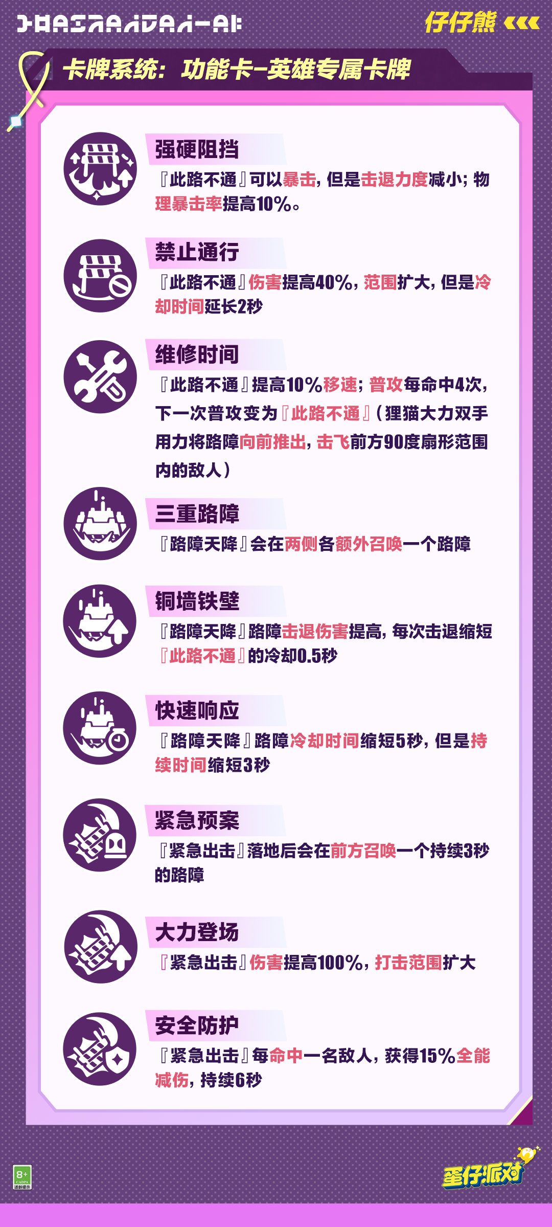 快来提前查收他的<技能简介>与<专属卡牌>,借助路障巧妙控场痛击敌方吧!