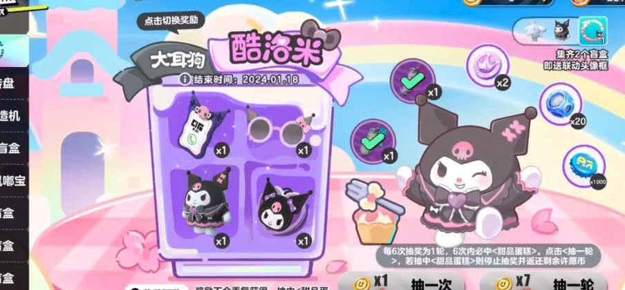 1、三丽鸥联动的两款皮肤是以限定盲盒的形式上架的,抽取保底是2400蛋币/只,两只全部入手的话就是480元。
