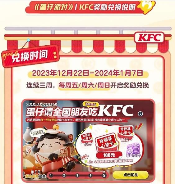 今天小编给大家带来了《蛋仔派对》请全国朋友吃KFC攻略分享,2023年12月22日至2024年1月7日蛋仔请全国朋友吃KFC活动上线,持续三周的周五、六、日每日限量10万份肯德基心意卡或不限量15枚彩虹币,完成任务后即可免费二选一!