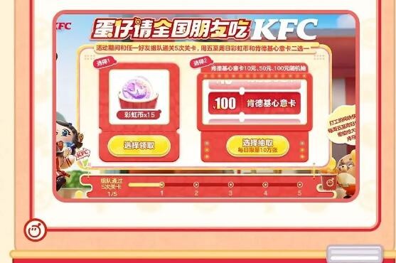 蛋仔们只需在活动期间组队通过5次关卡,就可在彩虹币和肯德基心意卡中二选一!