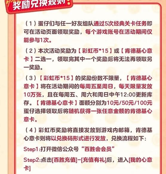 史无前例的请客将持续三周的周五、六、日,每日限量10万份肯德基心意卡或不限量15枚彩虹币,完成任务后即可免费二选一!