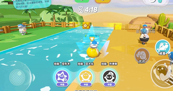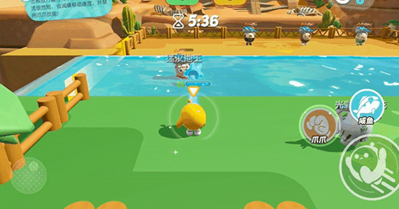 3、在对局中蛋仔们会有“爪爪”和“咸鱼”两个基础技能,分别可以将敌方蛋仔抓至自己身边和对敌方蛋仔进行攻击。在河道中会有不同道具漂浮而来,玩家可通过使用爪爪抓取获得或直接进入河道触碰道具。