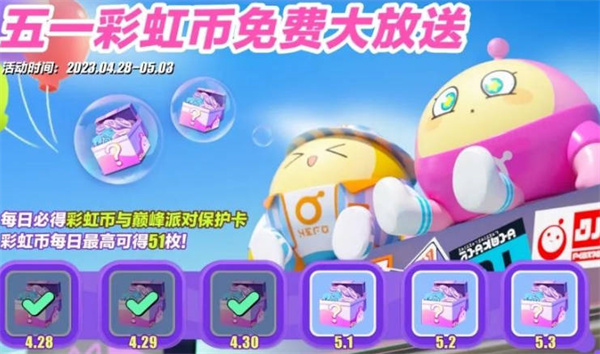 1:第一个活动就是五一彩虹币免费送,我们每天去签到可以获得不定数的彩虹币,每天最高可以获得51个彩虹币;