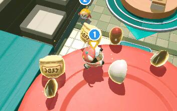 这样我们可以利用料理台位置不同的差异,不需要跑上跑下一个个来回去拿,只需要—个蛋仔在材料台上直接把材料扔下去,另一个蛋仔去放材料到制作台即可。那么,瓜子的话丢入最右边的位置,而红豆以及鸡蛋可以丢到中间的位置。分工合作,效率加倍。