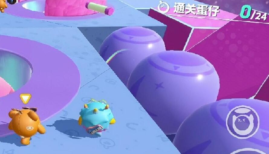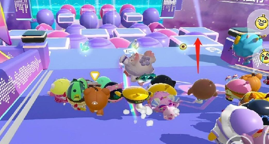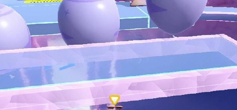 蛋仔派对有个小规律右边的人比左边少,所以我们从右边走开局比较稳。第一个滚动技能冷却好了以后直接开,连着跳下去。注意紫色气球可以踩,而粉色气球踩一下就会爆,会把蛋仔弹飞。