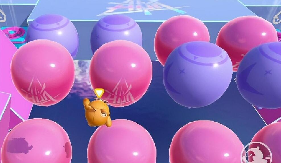 这个地方两个粉色的气球夹着一个紫色的气球,可以直接跳到第一个粉色气球上飞扑到第二个粉色气球上,会被弹飞到很远的地方。