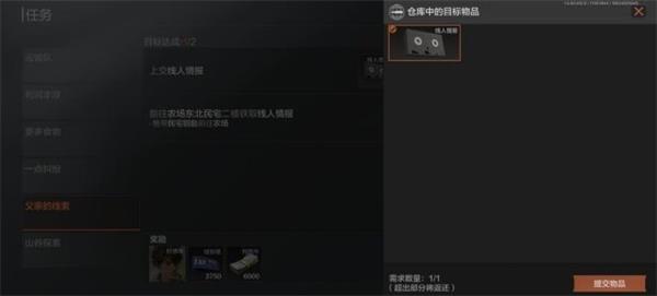 然后打开任务页面,点击提交会弹出一个窗口,选择里面的线人情报进行提交物品,这个任务就完成了。