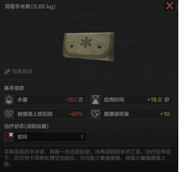 简易手术袋只可使用一次,健康值可回复10点,启用时长18秒,健康值上限扣除60%,减少自身水量10/次。
