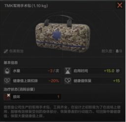 TMK军用手术包的耐久度是8点,健康值可回复15点,启用时长15秒,健康值上限扣除20%,减少自身水量3/次。