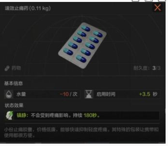 速效止痛药的耐久是3点,镇静时长持续180秒,启用时长3.5秒,减少自身水量10/次。