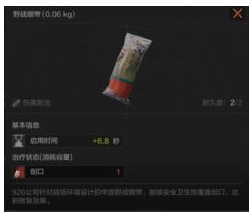 快捷绷带也是只能使用一次,启用时长是6.8秒。创口处理之后需要配合上面讲的急救包和止痛药进行使用。大家可以在一些基础刷药的地点进行捡取。